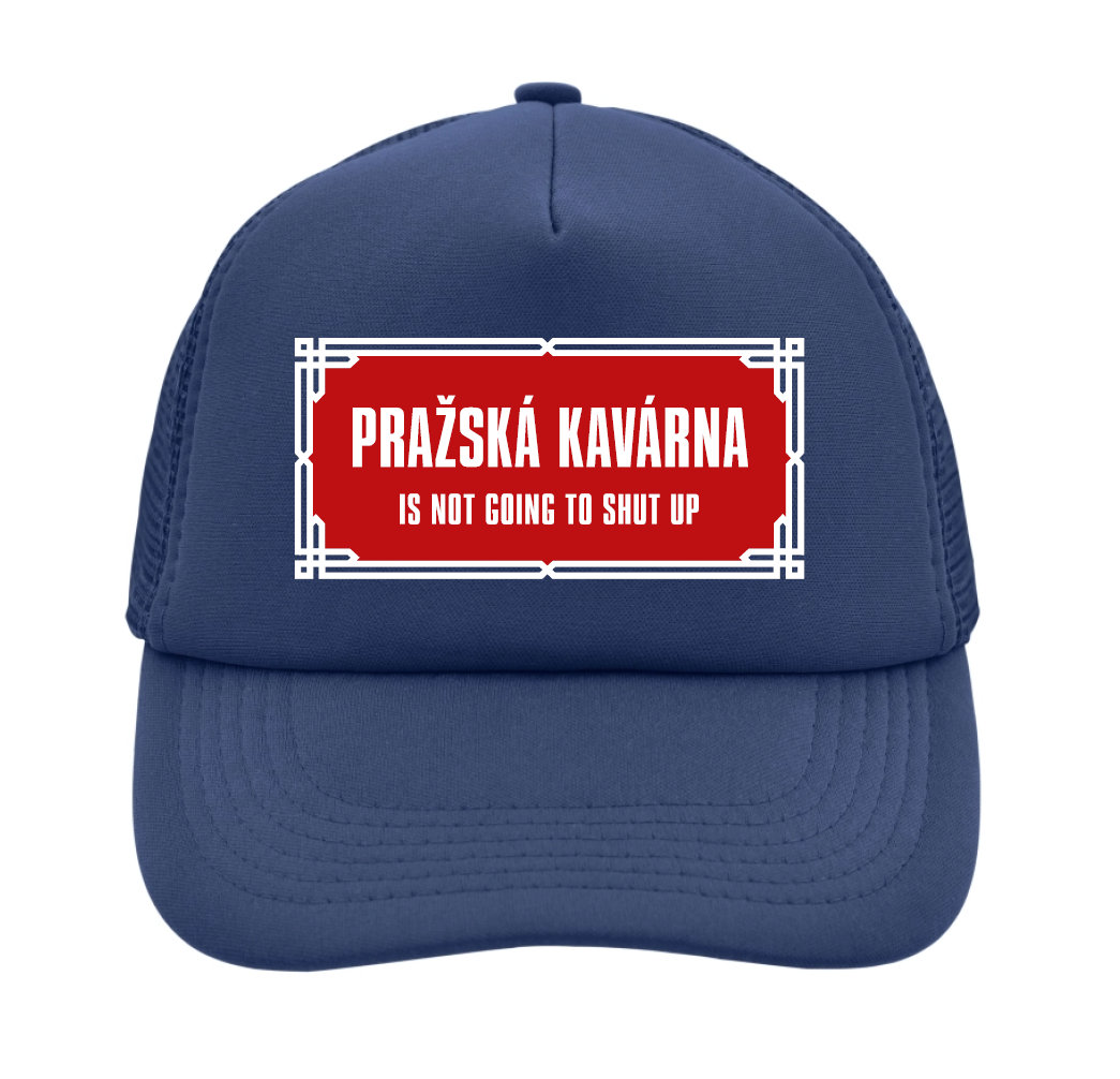 Čepice truckerka se síťkou v námořnické modré s potiskem Pražská Kavárna